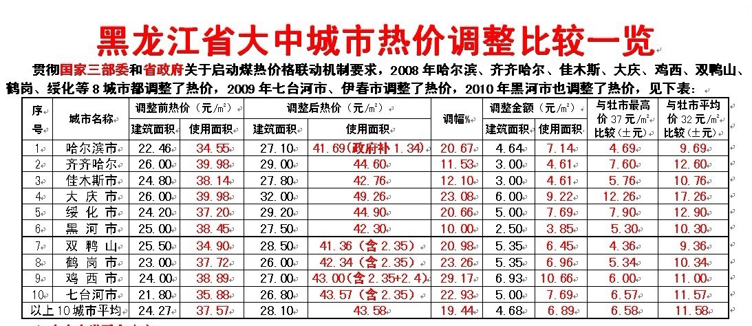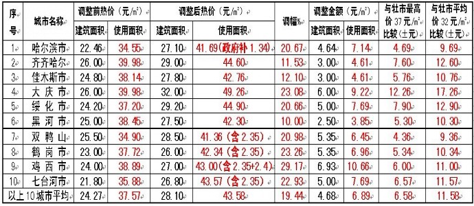 黑龍江省大中城市熱價(jià)調(diào)整比較一覽